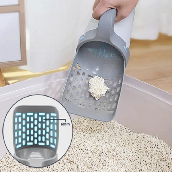 🐾 O lopățică inovatoare pentru nisipul de pisici cu suport pentru pungi permite curățarea ușoară și curată.