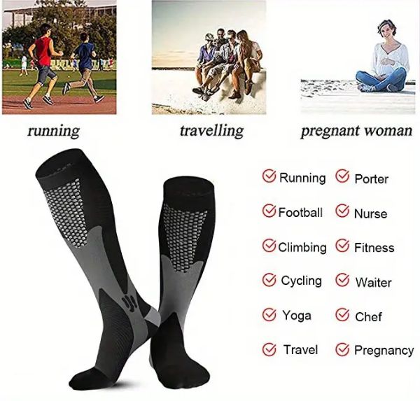 Un cadou excelent pentru pasionații de alergări Aceste șosete de compresie confortabile din nailon oferă o respirabilitate și o elasticitate excelentă, ceea ce le fac potrivite pentru reducerea disconfortului muscular în timpul evenimentelor de alergare pe distanțe lungi. Sunt, de asemenea, potrivite pentru alergători, jucători de baschet și fotbal, persoane angajate în antrenamente încrucișate, precum și pentru cei care participă la antrenamente în sala de gimnastică, drumeții și trasee montane.