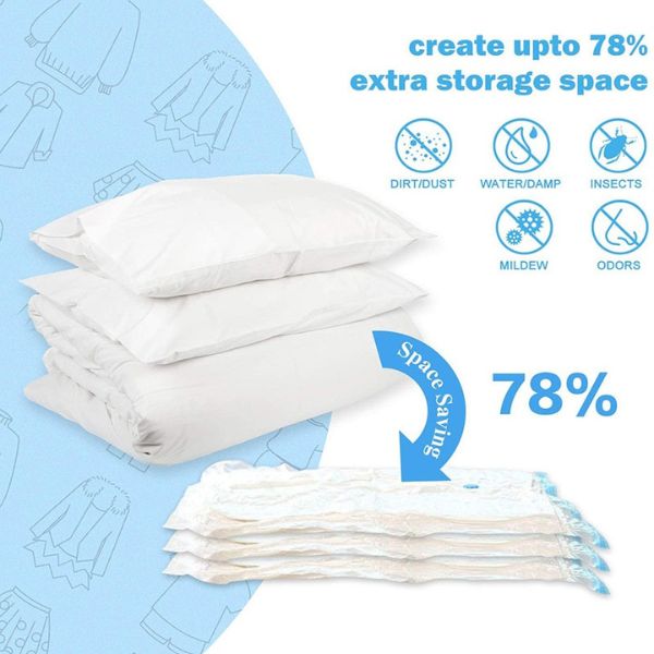 Puteți economisi până la 80% din spațiu folosind sacii de vid care sunt ideali pentru toate nevoile dvs. de depozitare. După închidere, aceștia pot fi depozitați cu ușurință sub pat, pe raft sau în dulap.