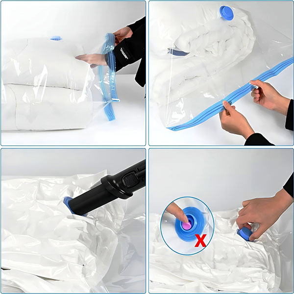 În doar trei pași simpli puteți economisi spațiu în dulap. Puneți-vă mai întâi lucrurile într-un sac, apoi închideți-l cu grijă și, la final, folosiți un aspirator sau o pompă pentru a elimina aerul.