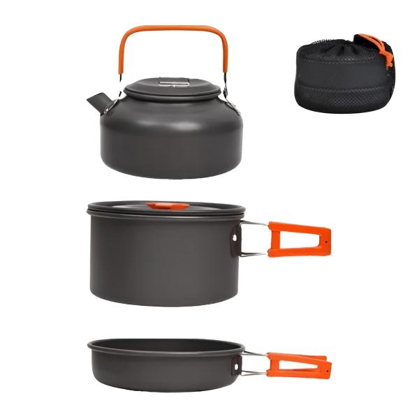 tigaie și oală cu capace, un ceainic și o geantă de depozitare.