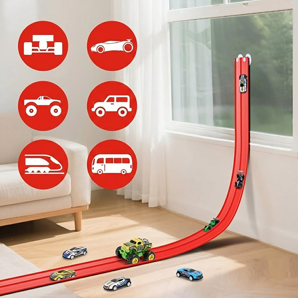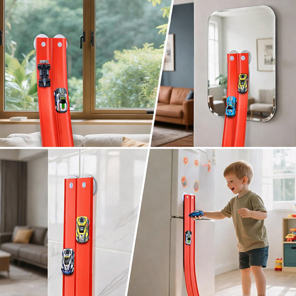 Fixarea cu ventuze permite copiilor și părinților să ajusteze rapid unghiurile și configurațiile, astfel încât pista poate fi reconstruită din nou și din nou fără unelte sau instalări complicate.