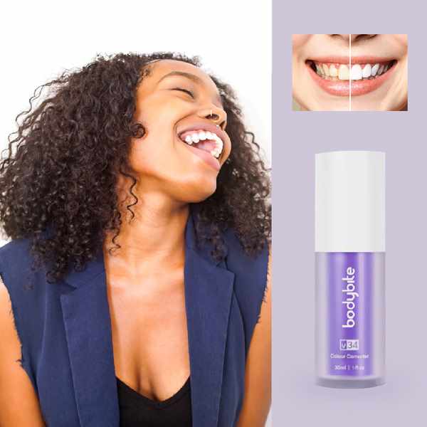 V34 utilizează tehnologia de corecție a culorii pentru a spori vizibil luminozitatea zâmbetului tău. Deoarece movul este culoarea complementară a galbenului, formula ajută la echilibrarea tonurilor galbene nedorite pentru un aspect mai uniform și radiant. Rezultatul este un zâmbet cu aspect instantaneu mai proaspăt — fără tratamente dure sau pași complicați.